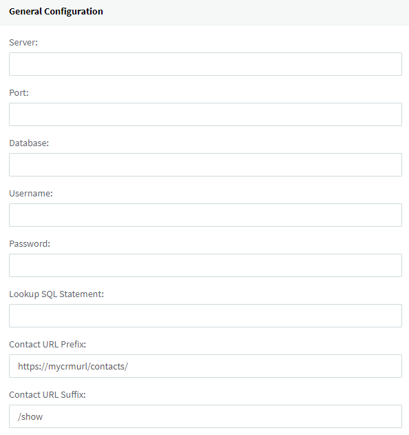 4. Enter the Contact URL prefix and suffix. These are required to create the Contact URL, which is the concatenation of the Contact URL Prefix, the ContactID returned by the database, and the Contact URL Suffix. This Contact URL is considered the key for the contact in 3CX Contacts, and is used to update the contact if any change is detected in the database. Also, this Contact URL is shown in the 3CX Web Client, so if you have a web page to show the contact record, use these settings to create the URL to point to that page.